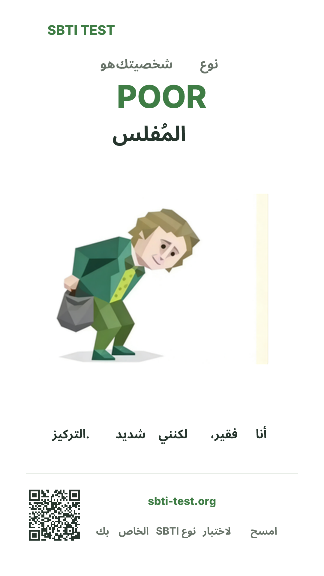 تهانينا، لقد حصلت على POOR. هذا الفقر ليس حكماً على رصيد المحفظة، بل إعادة توزيع للموارد بعد قطع الرغبات. الآخرون يبعثرون طاقتهم كرموز QR في السماء، أما أنت فتضغط طاقتك في شعاع ليزر؛ حيثما تسلطه يبدأ الدخان. عالم POOR بسيط: ما ليس مهماً يُخفض ضجيجه، وما هو مهم يُضرب حتى النهاية. الصخب، العلاقات الاجتماعية، الزهو، إثبات الوجود في كل مكان؟ آسف، لا وقت. ليست مواردك قليلة؛ أنت صببتها كلها في حفرة واحدة، فيبدو الأمر فقراً من الخارج، لكنه في الحقيقة منجم. متى قررت أن شيئاً يستحق الحفر، يصبح ضجيج العالم مجرد خلفية.